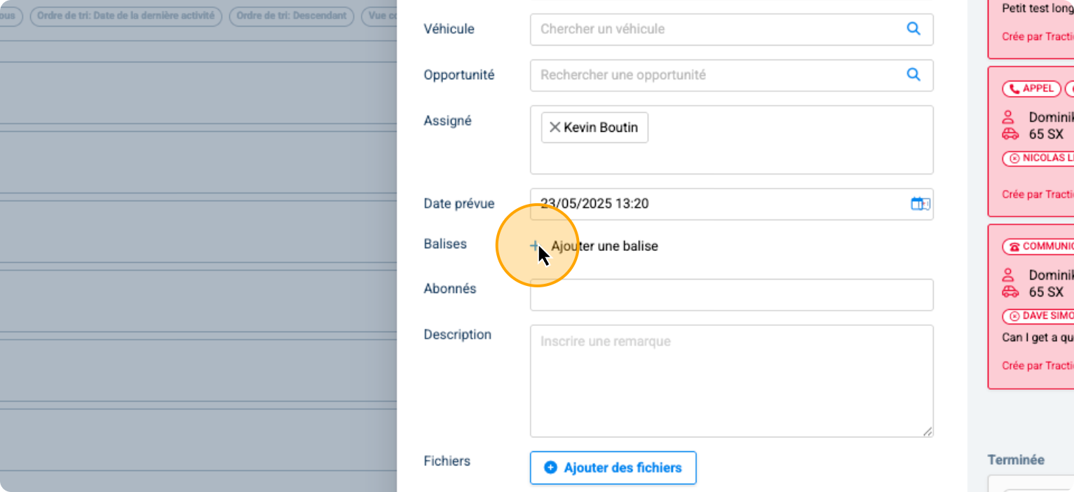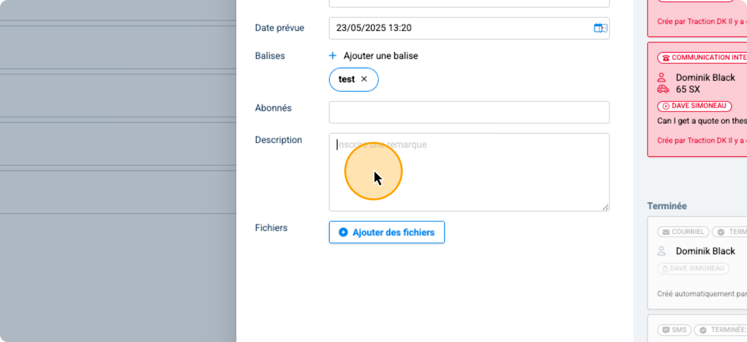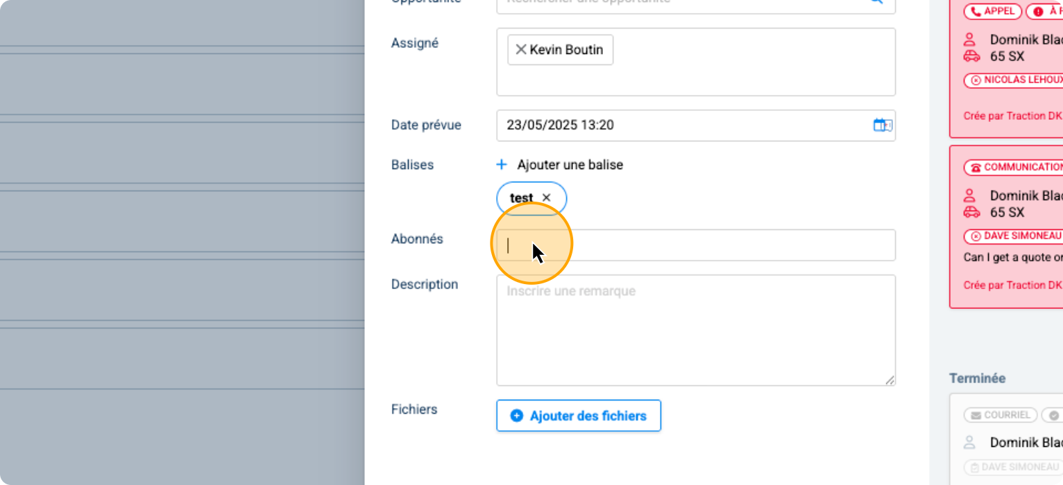 Ensuite, assignez la tâche à un utilisateur, choisissez une date et une heure, et appliquez des balises pour faciliter la recherche future. Vous pouvez également vous abonner à la tâche pour suivre son avancement. Ajoutez une description et des fichiers si nécessaire, puis sauvegardez votre tâche.