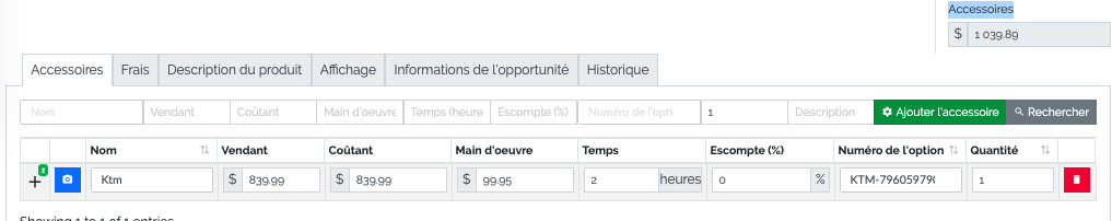 Ajouter des accessoires au produit en inscrivant le numéro ou le nom de la pièce et une sélection sortira. Vous devez choisir la pièce qui vous convient. Vous pouvez ajouter le nombre d'accessoires que le client désire. Les cases grises ne sont pas modifiables. Toutes les informations proviennent du module Product Manager.